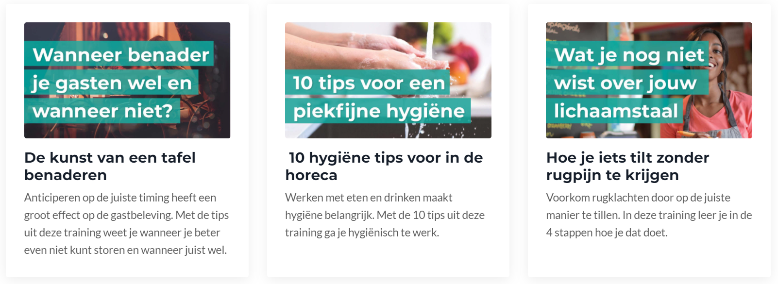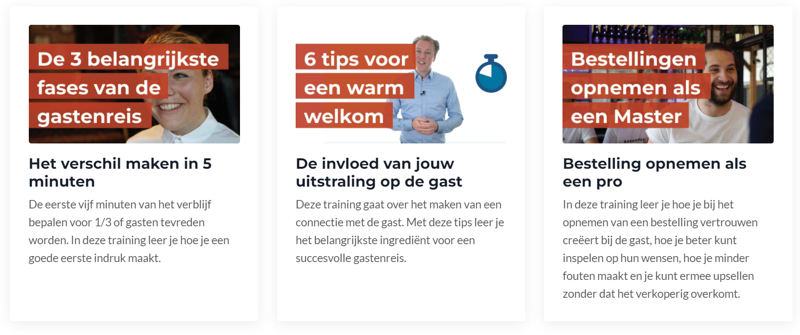 De inwerkmodules zijn de warming-up voor iedere horecamedewerker. In korte video’s behandelen we alle tips en tricks die je nodig hebt om goed te starten. Wij laten jou merken dat jij over enorme talenten beschikt.