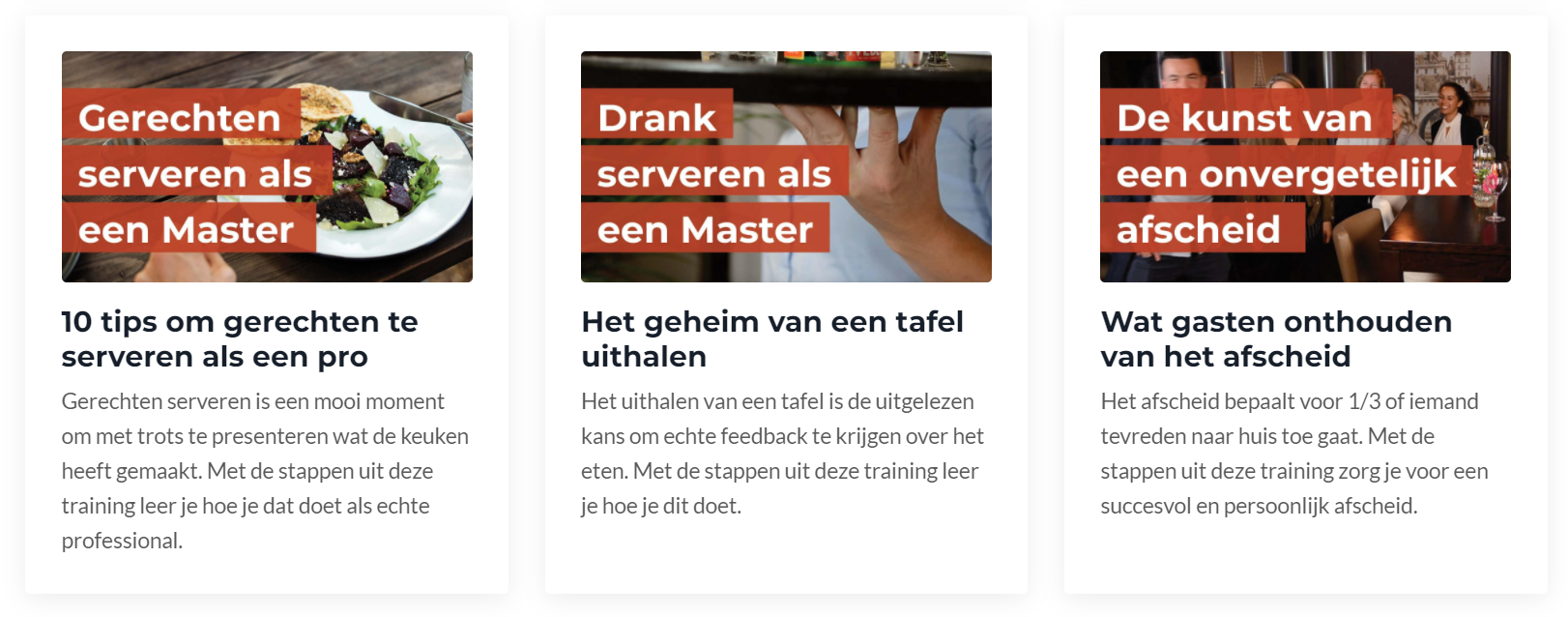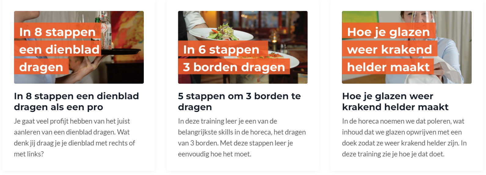 Persoonlijke verzorging | Hygiëne | Vaktermen | Non-verbale communicatie | De ontvangst | Bestellingen opnemen | Hoe je serveert | Een persoonlijk afscheid | 3 borden dragen | Dienblad dragen | Poleren | Tafels indekken